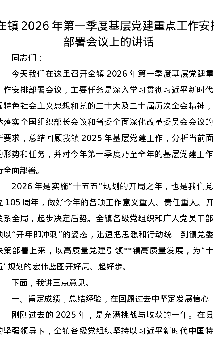 在镇2026年第一季度基层党建重点工作安排部署会议上的讲话