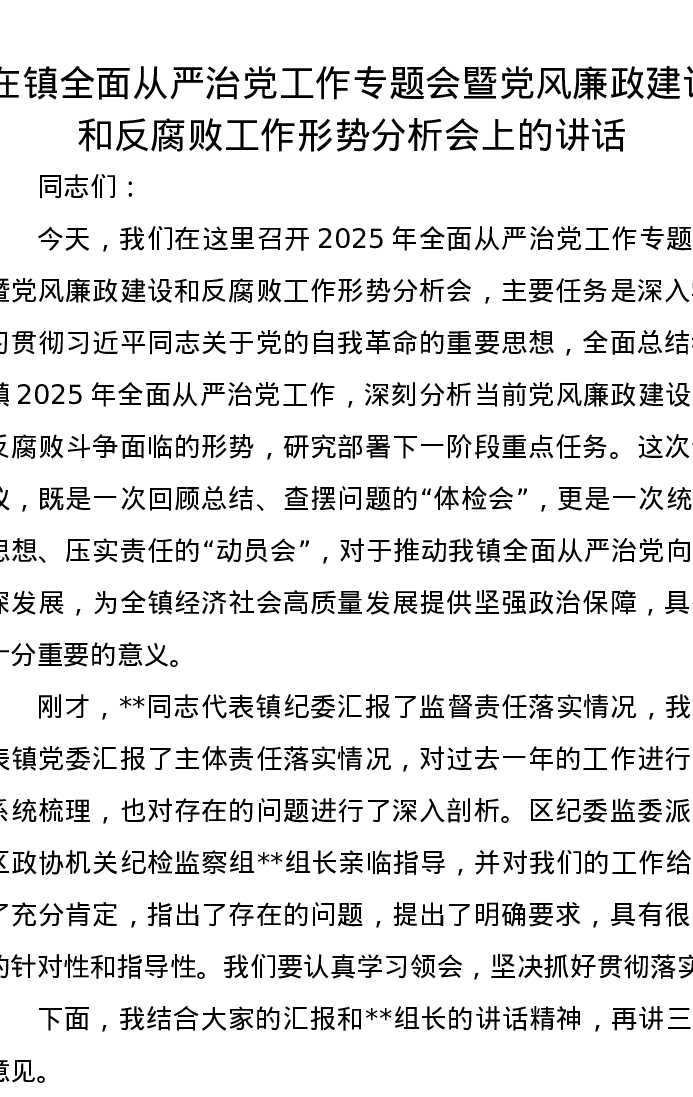 在镇全面从严治党工作专题会暨党风廉政建设和反腐败工作形势分析会上的讲话
