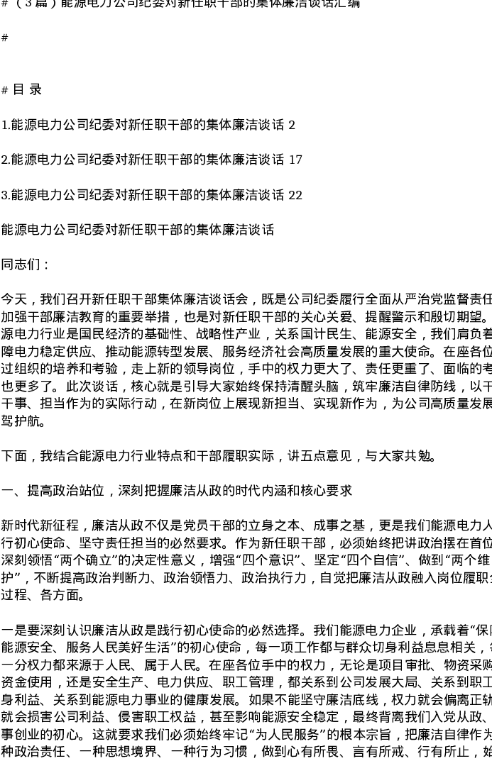 汇编:能源电力公司纪委对新任职干部的集体廉洁谈话3篇