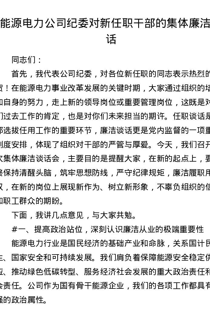 能源电力公司纪委对新任职干部的集体廉洁谈话(3995字)