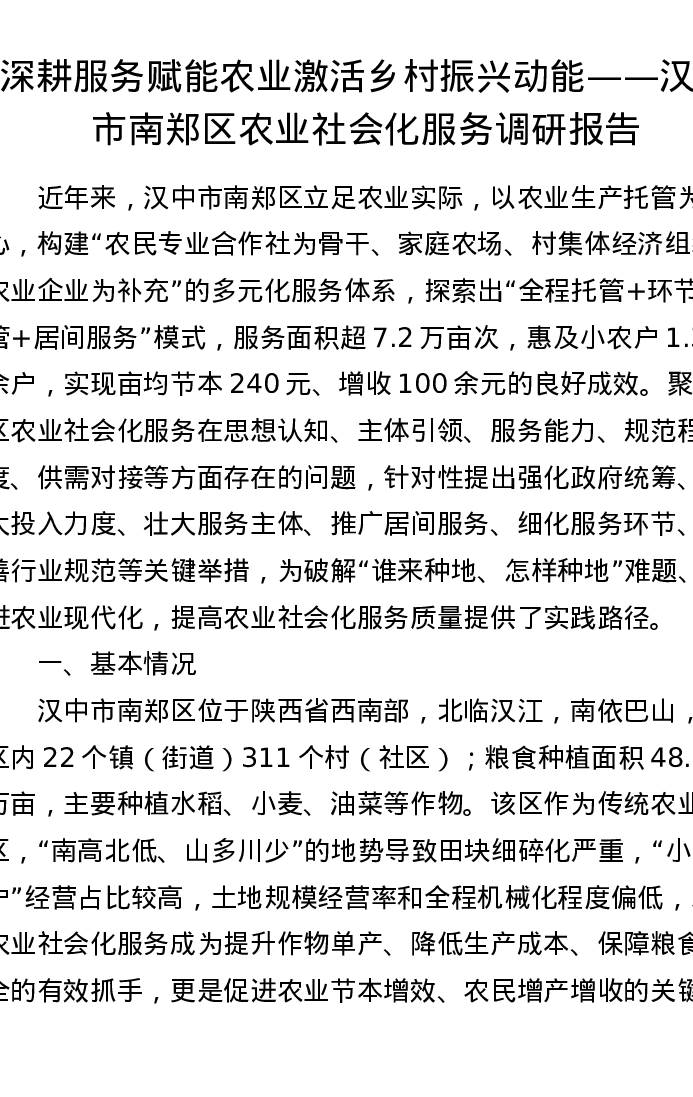 深耕服务赋能农业 激活乡村振兴动能——汉中市南郑区农业社会化服务调研报告