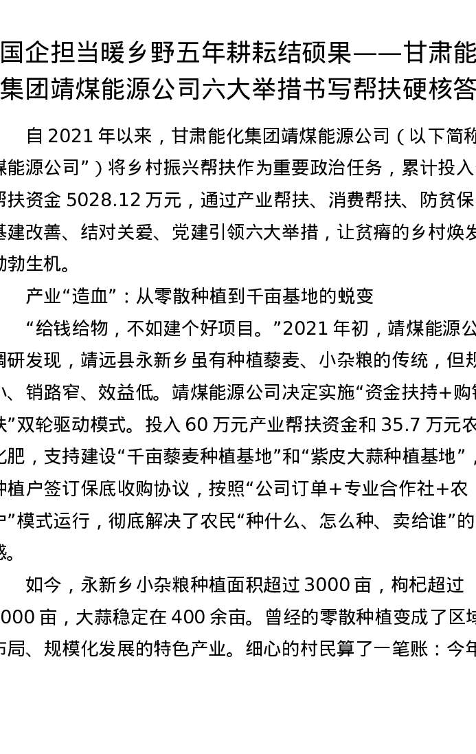 国企担当暖乡野 五年耕耘结硕果——甘肃能化集团靖煤能源公司六大举措书写帮扶硬核答卷