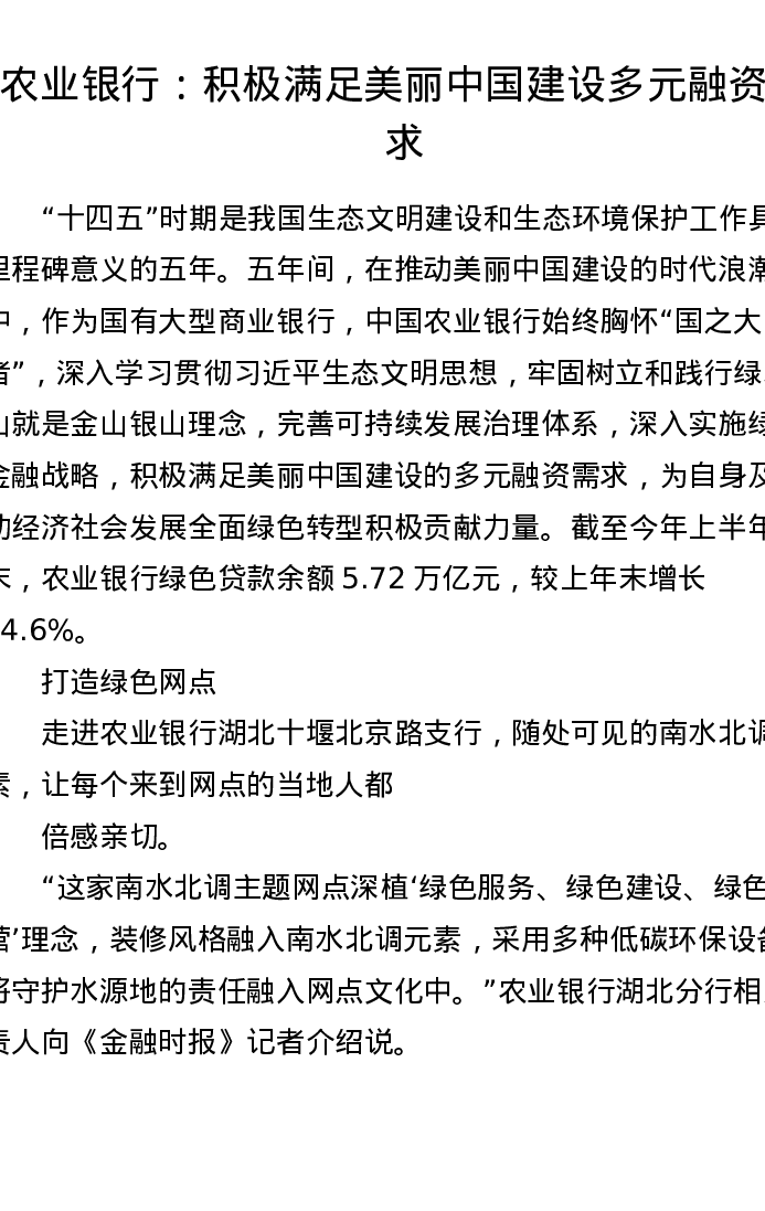 农业银行:积极满足美丽中国建设多元融资需求