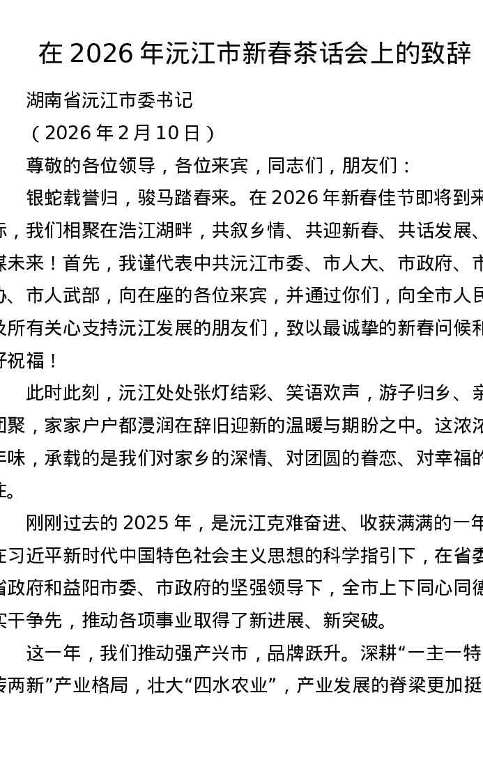 在2026年沅江市新春茶话会上的致辞