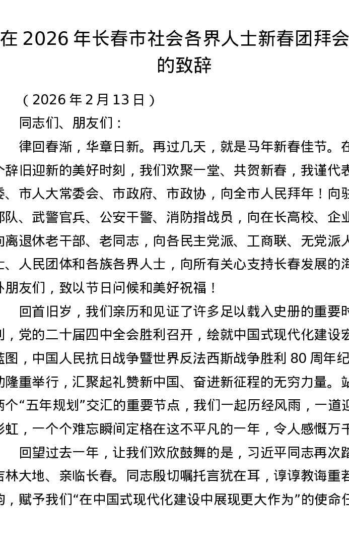 在2026年长春市社会各界人士新春团拜会上的致辞