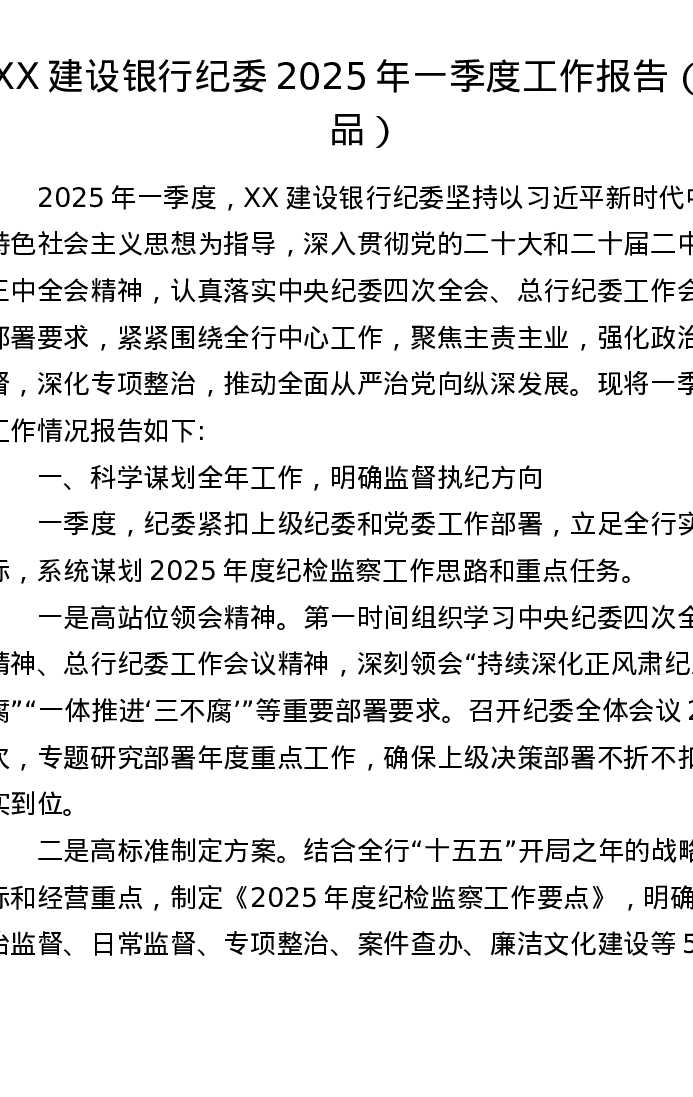 XX建设银行纪委2025年一季度工作报告