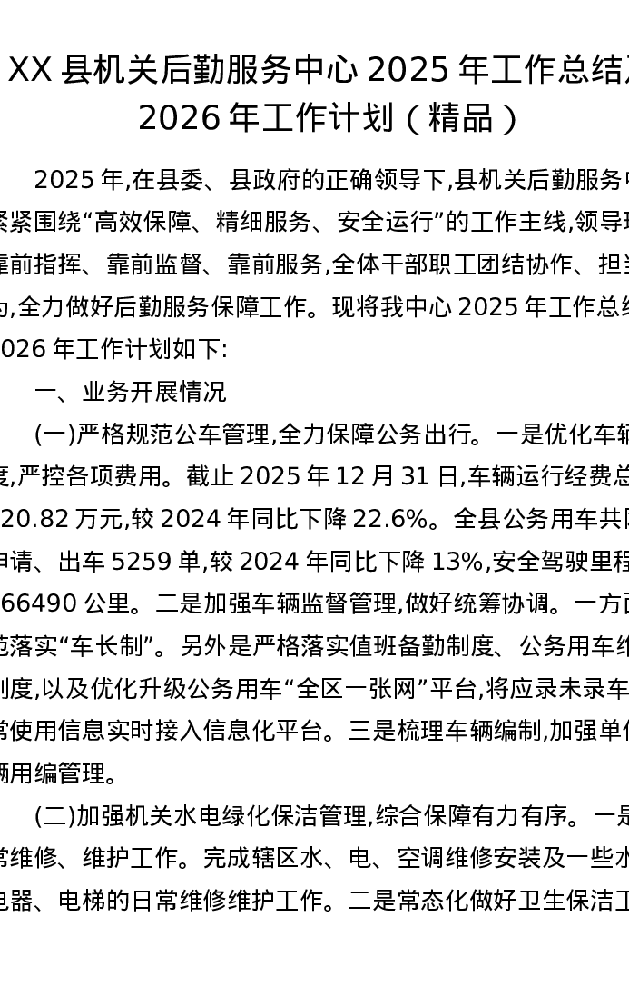 XX县机关后勤服务中心2025年工作总结及2026年工作计划
