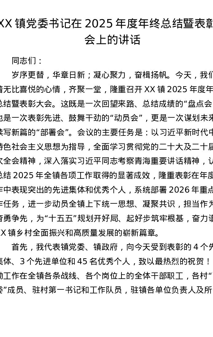 XX镇党委书记在2025年度年终总结暨表彰大会上的讲话(12393字)
