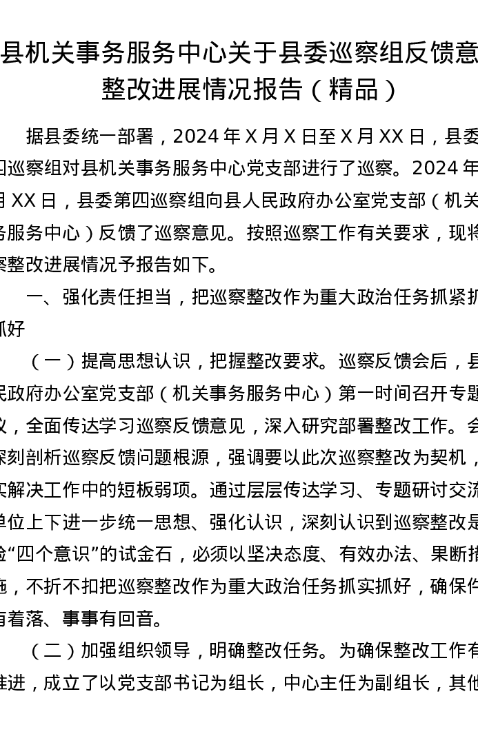 县机关事务服务中心关于县委巡察组反馈意见整改进展情况报告