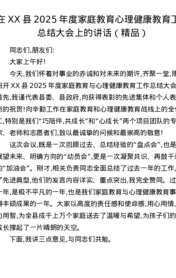在XX县2025年度家庭教育心理健康教育工作总结大会上的讲话(精品)