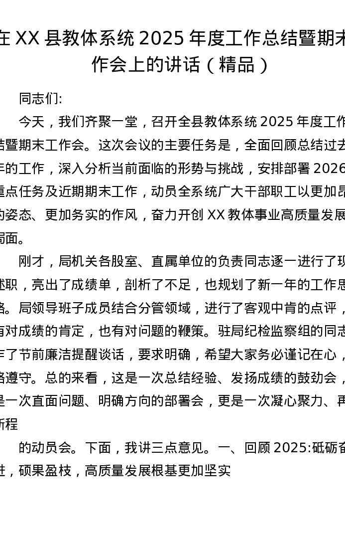 在XX县教体系统2025年度工作总结暨期末工作会上的讲话(精品)