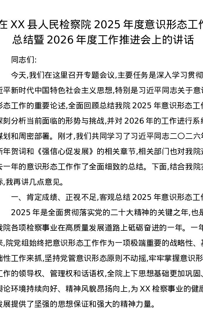 在XX县人民检察院2025年度意识形态工作总结暨2026年度工作推进会上的讲话