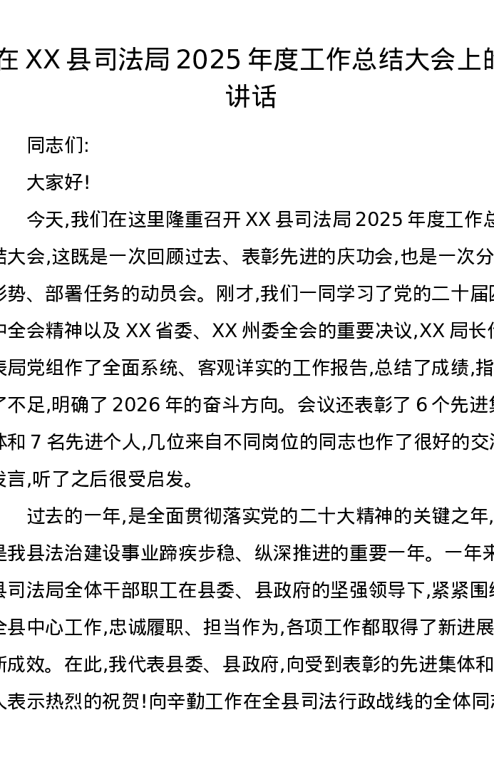 在XX县司法局2025年度工作总结大会上的讲话