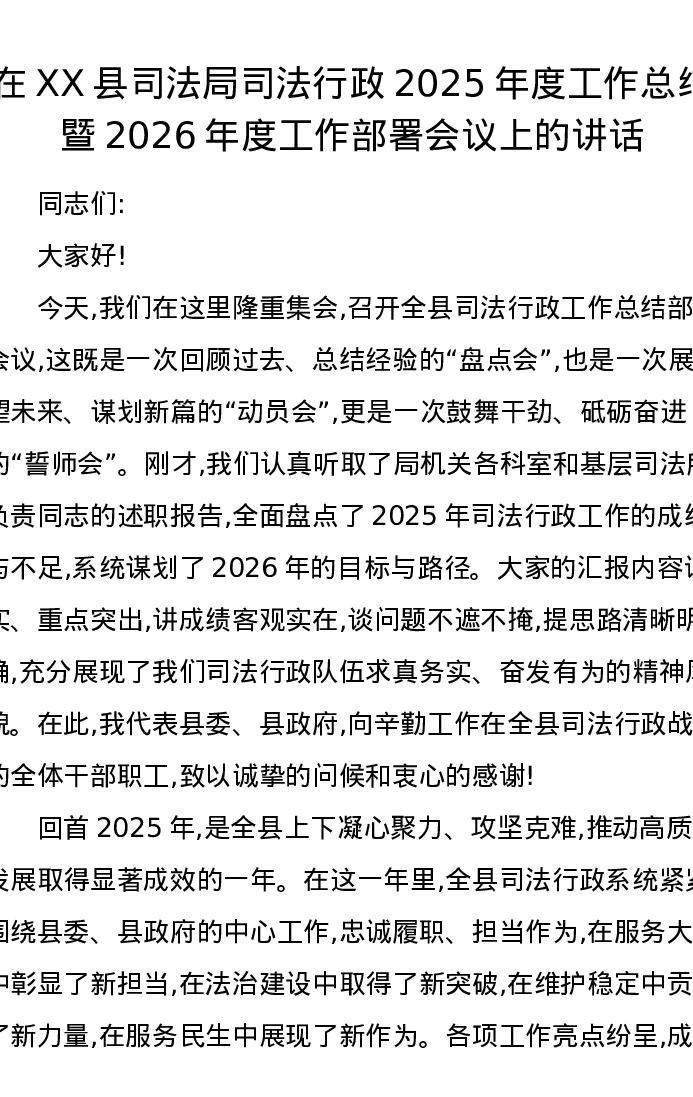 在XX县司法局司法行政2025年度工作总结暨2026年度工作部署会议上的讲话