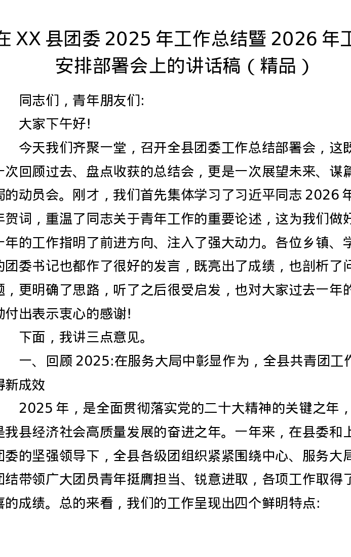 在XX县团委2025年工作总结暨2026年工作安排部署会上的讲话稿