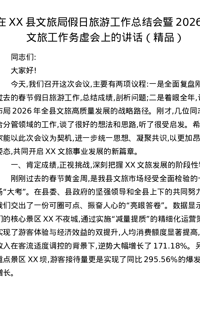在XX县文旅局假日旅游工作总结会暨2026年文旅工作务虚会上的讲话