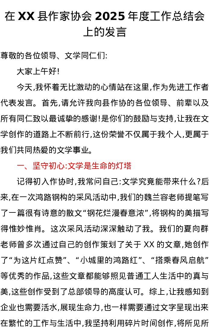 在XX县作家协会2025年度工作总结会上的发言2篇