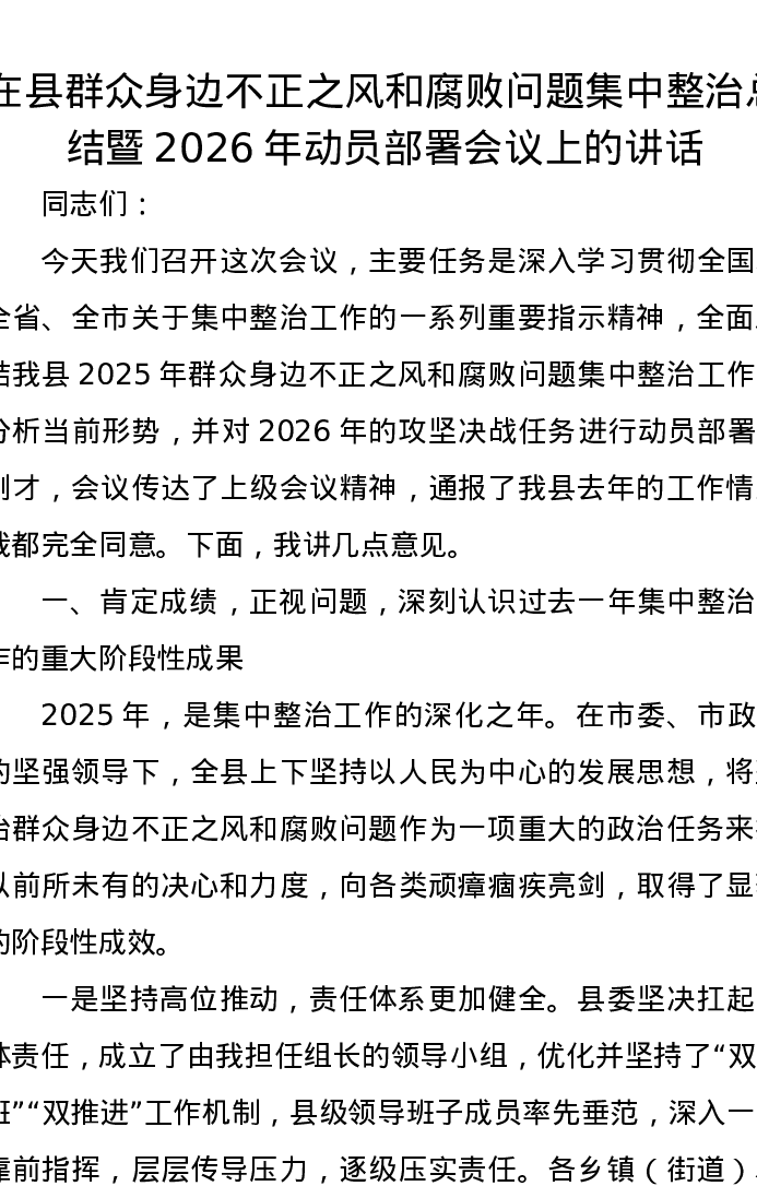 在县群众身边不正之风和腐败问题集中整治总结暨2026年动员部署会议上的讲话