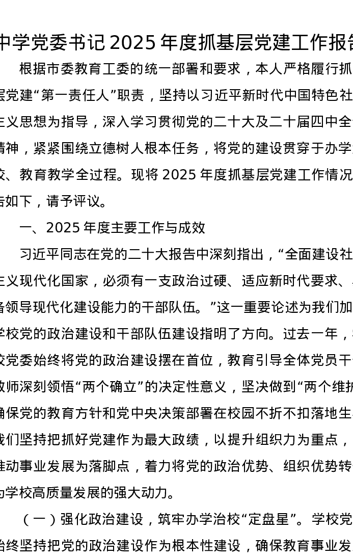 中学党委书记2025年度抓基层党建工作报告