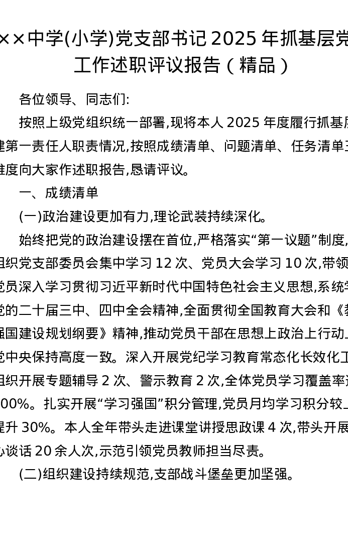 ××中学(小学)党支部书记2025年抓基层党建工作述职评议报告