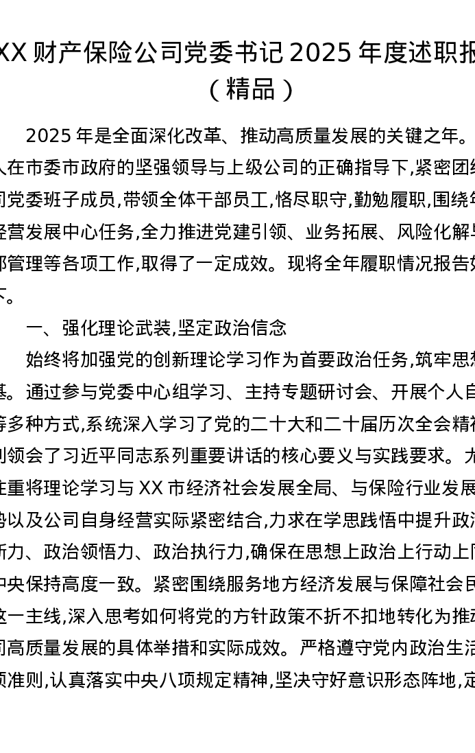 XX财产保险公司党委书记2025年度述职报告(精品)
