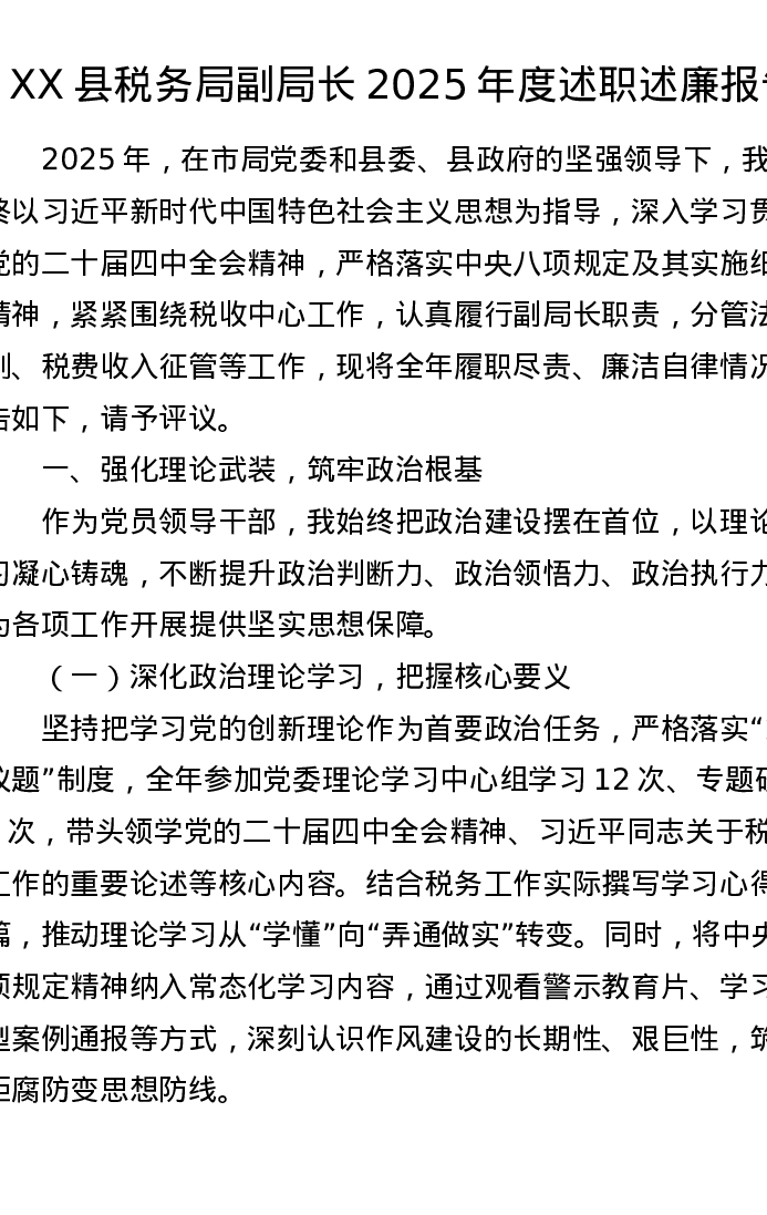 XX县税务局副局长2025年度述职述廉报告