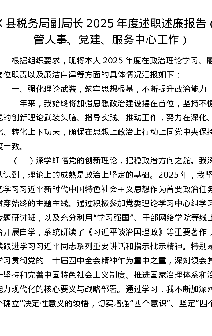X县税务局副局长2025年度述职述廉报告(分管人事、党建、服务中心工作)