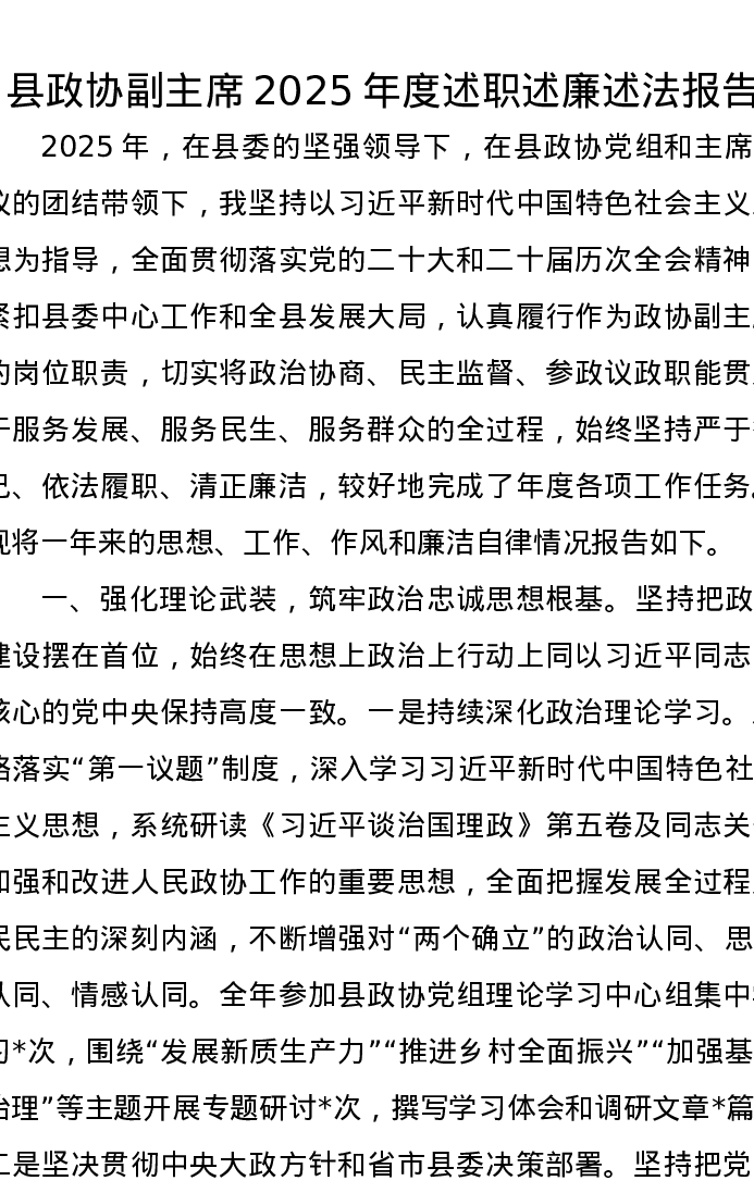 县政协副主席2025年度述职述廉述法报告
