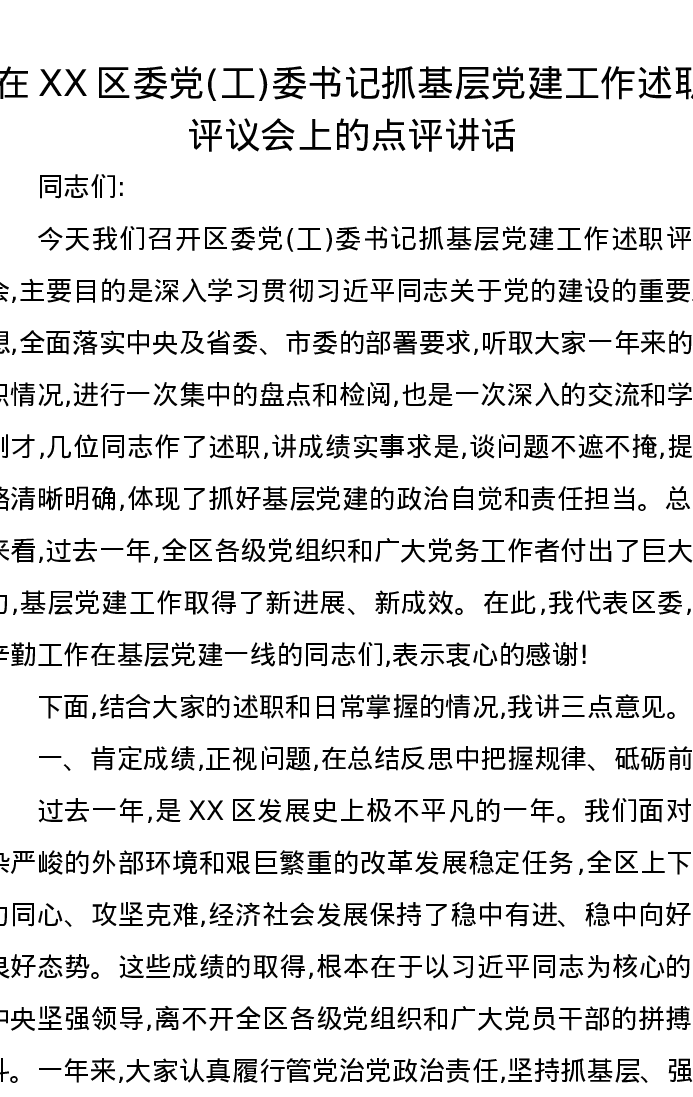 在XX区委党(工)委书记抓基层党建工作述职评议会上的点评讲话