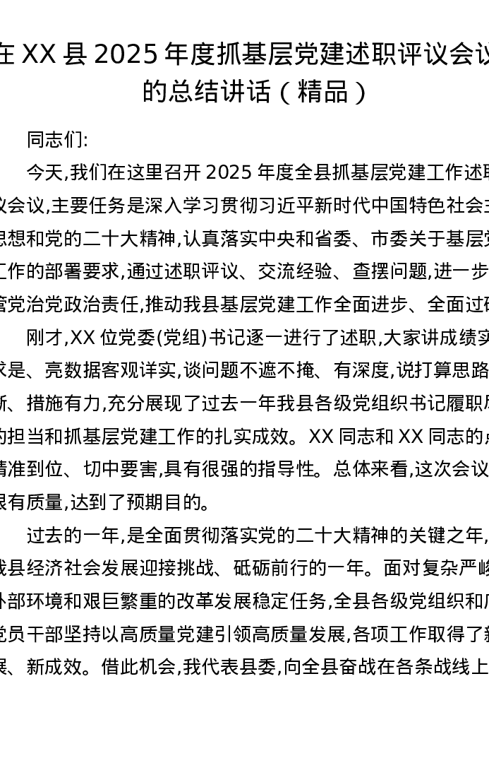 在XX县2025年度抓基层党建述职评议会议上的总结讲话