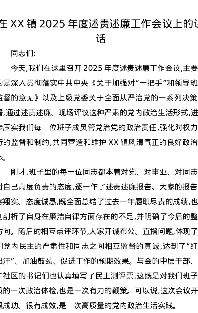 在XX镇2025年度述责述廉工作会议上的讲话