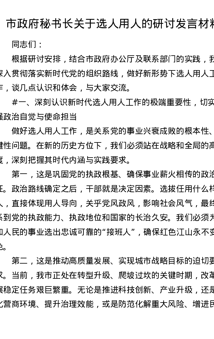 市政府秘书长关于选人用人的研讨发言材料(3898字)