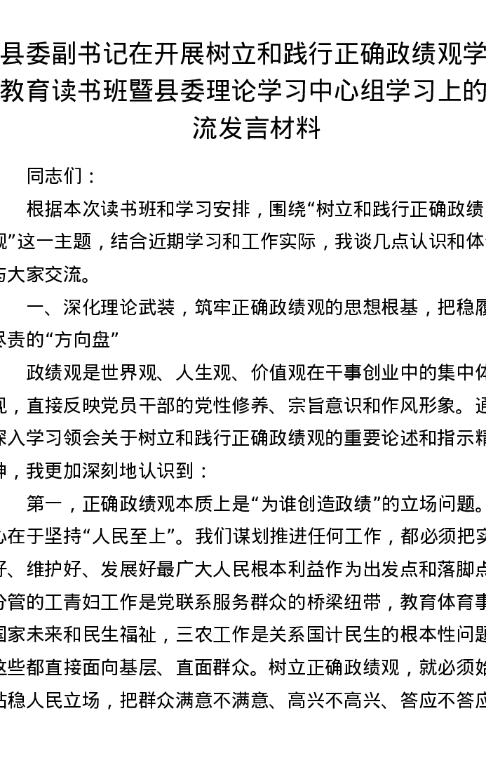 县委副书记在开展树立和践行正确政绩观学习教育读书班暨县委理论学习中心组学习上的交流发言材料2