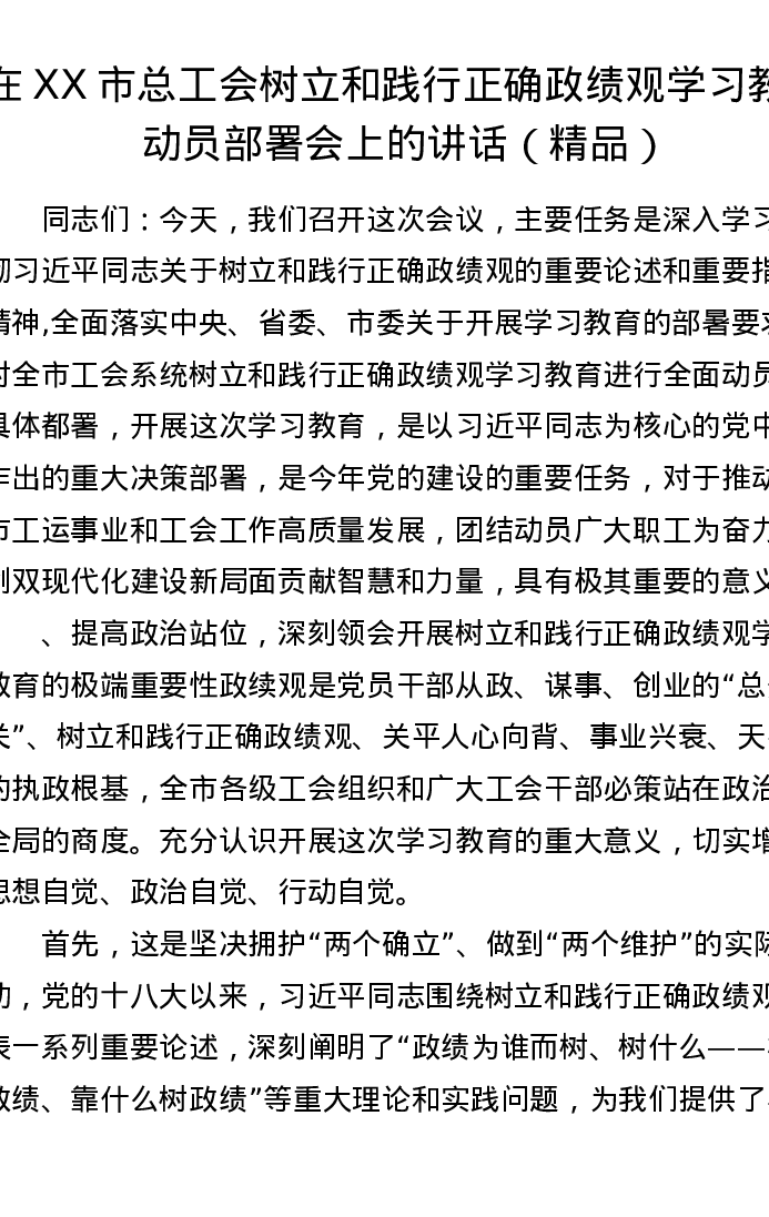 在XX 市总工会树立和践行正确政绩观学习教育动员部署会上的讲话