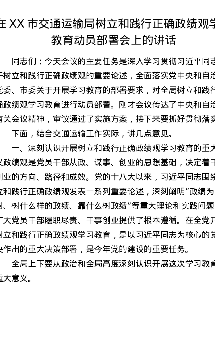 在XX市交通运输局树立和践行正确政绩观学习教育动员部署会上的讲话