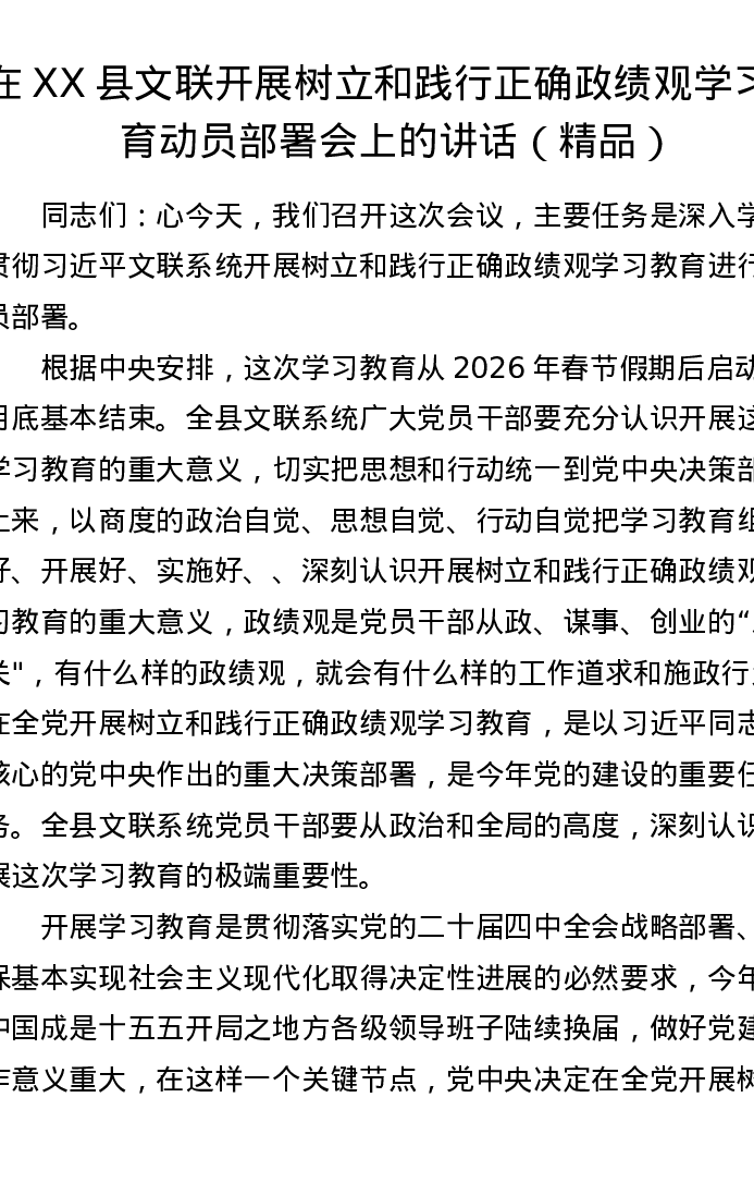 在XX县文联开展树立和践行正确政绩观学习教育动员部署会上的讲话
