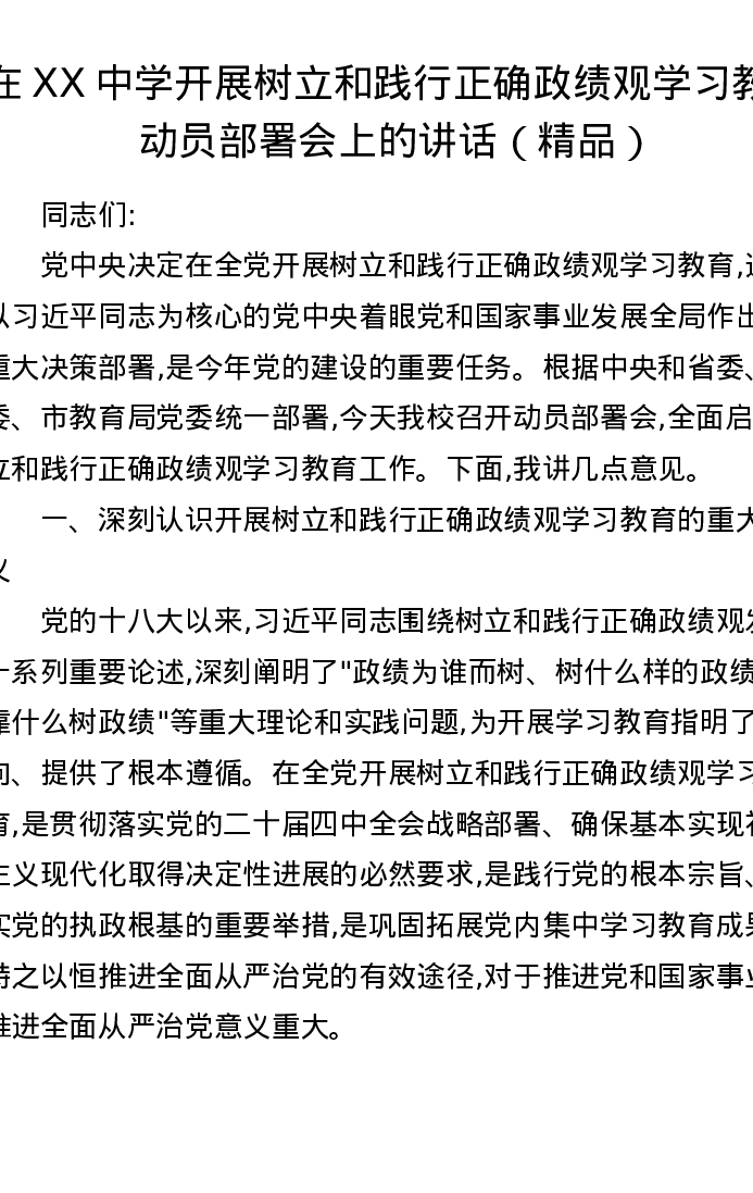 在XX中学开展树立和践行正确政绩观学习教育动员部署会上的讲话
