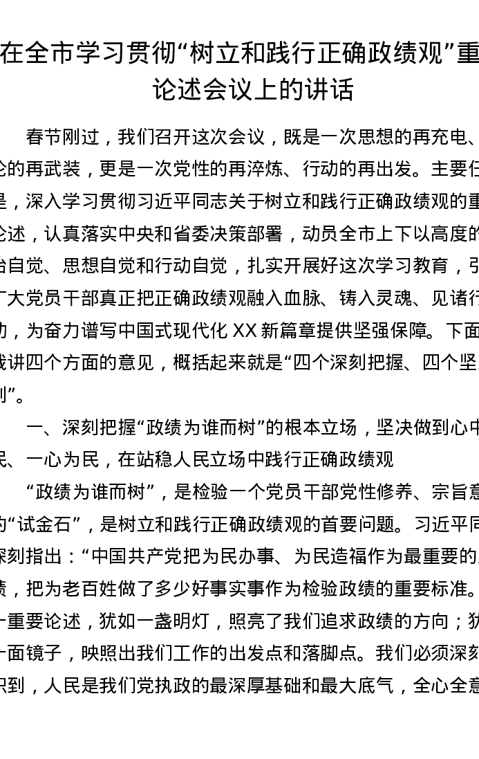 在全市学习贯彻树立和践行正确政绩观重要论述会议上的讲话