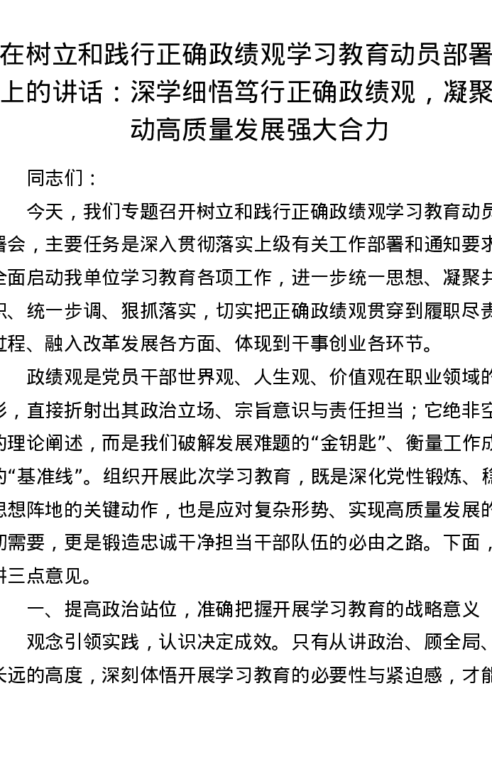在树立和践行正确政绩观学习教育动员部署会上的讲话:深学细悟笃行正确政绩观,凝聚推动高质量发展强大合力