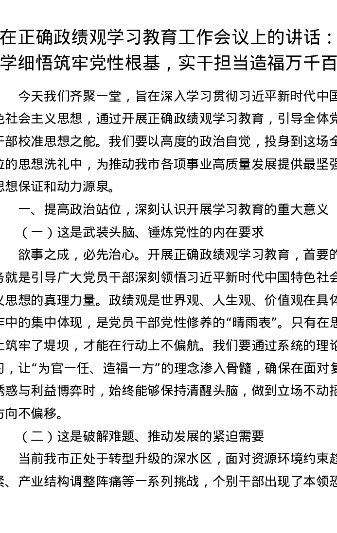 在正确政绩观学习教育工作会议上的讲话:深学细悟筑牢党性根基,实干担当造福万千百姓