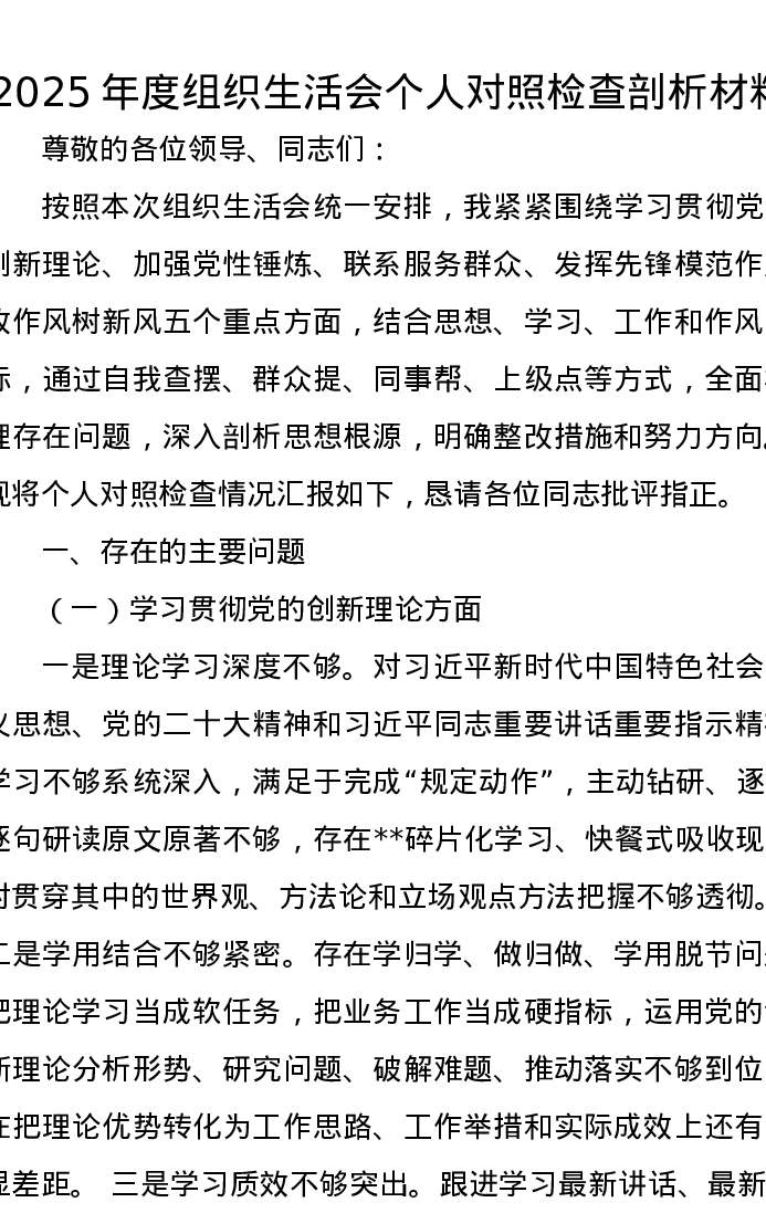 2025年度组织xxx个人对照检查剖析材料