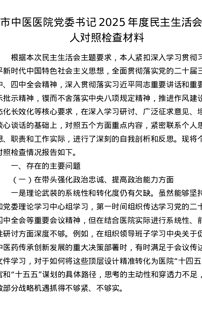 市中医医院党委书记2025年度xxxxx个人对照检查材料