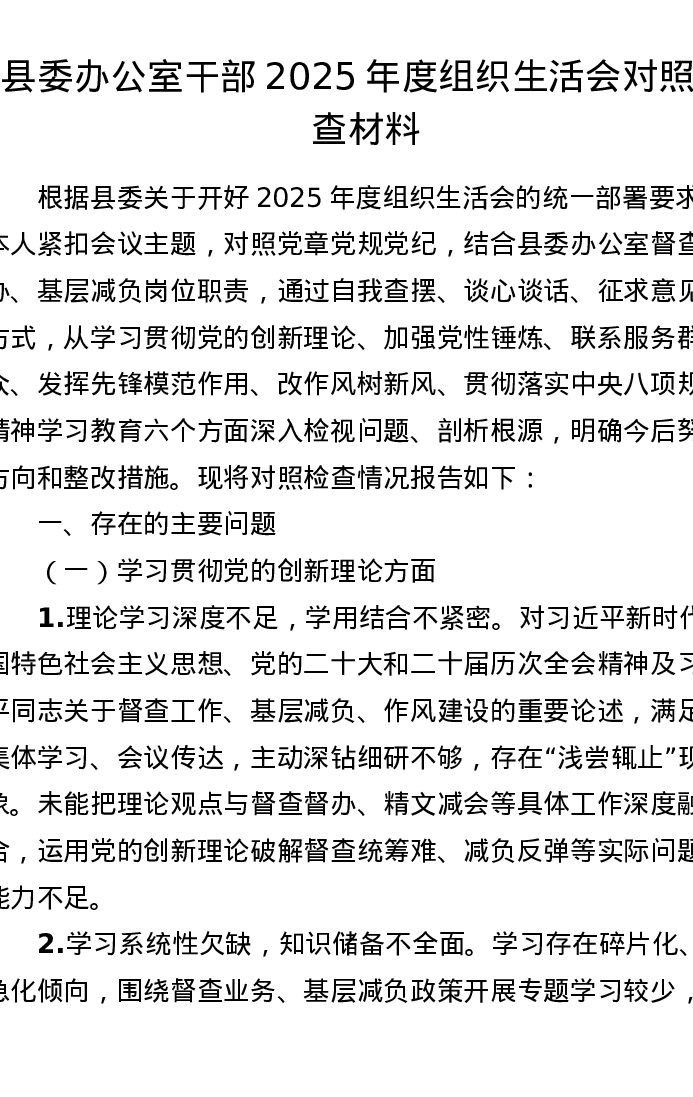 县委办公室干部2025年度组织xxx对照检查材料2