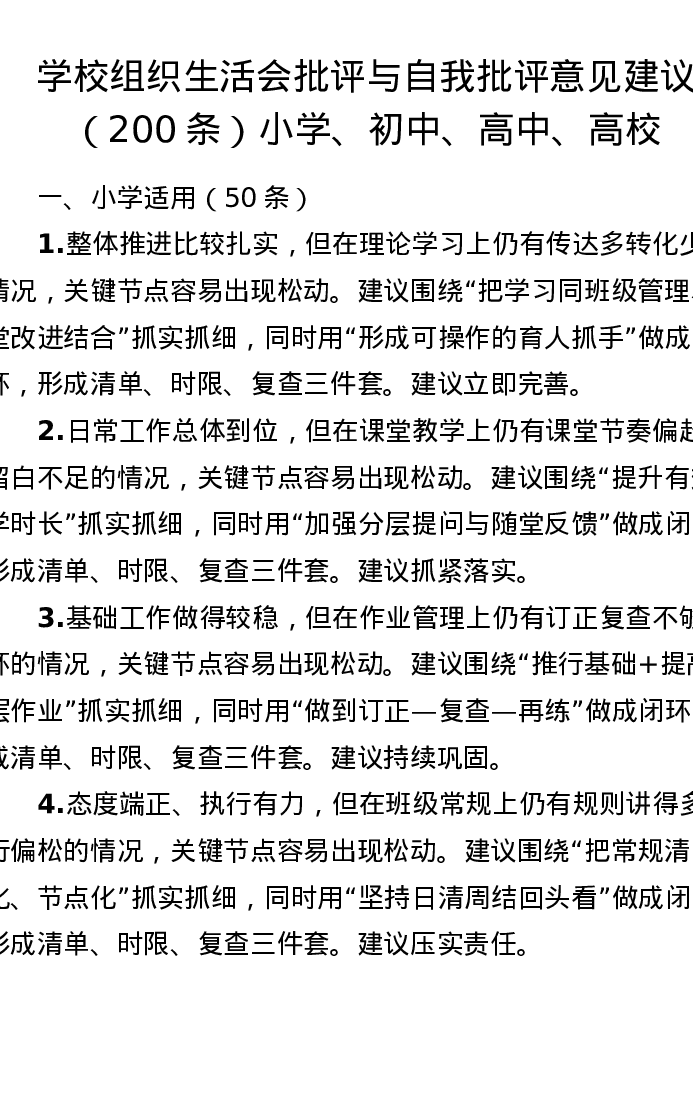 学校组织xxx批评与自我批评意见建议(200条)小学、初中、高中、高校