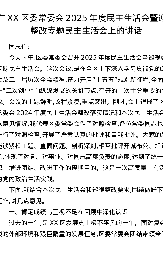 在XX区委常委会2025年度xxxxx暨巡视整改专题xxxxx上的讲话