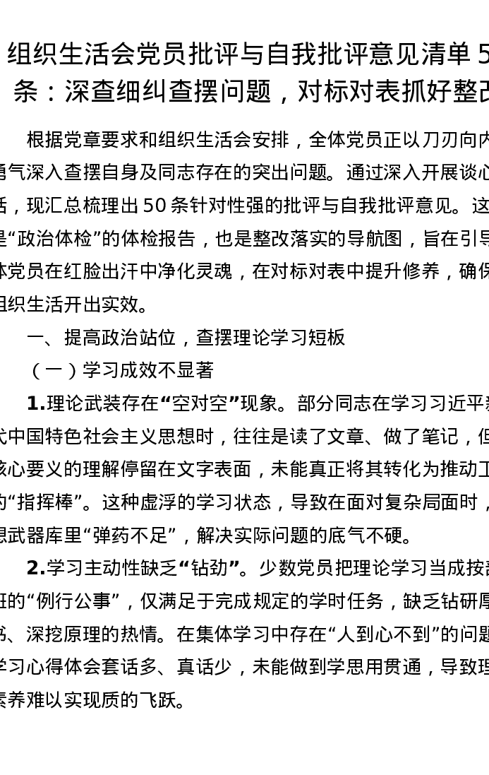 组织xxx党员批评与自我批评意见清单50条:深查细纠查摆问题,对标对表抓好整改