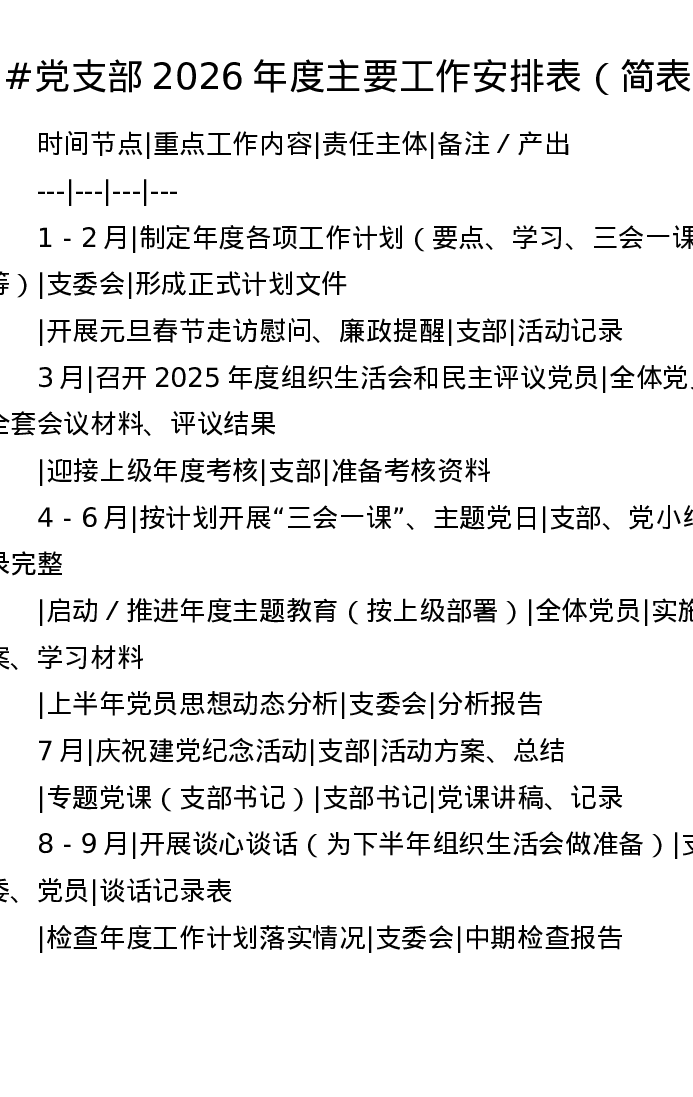 党支部2026年度主要工作安排表(简表)