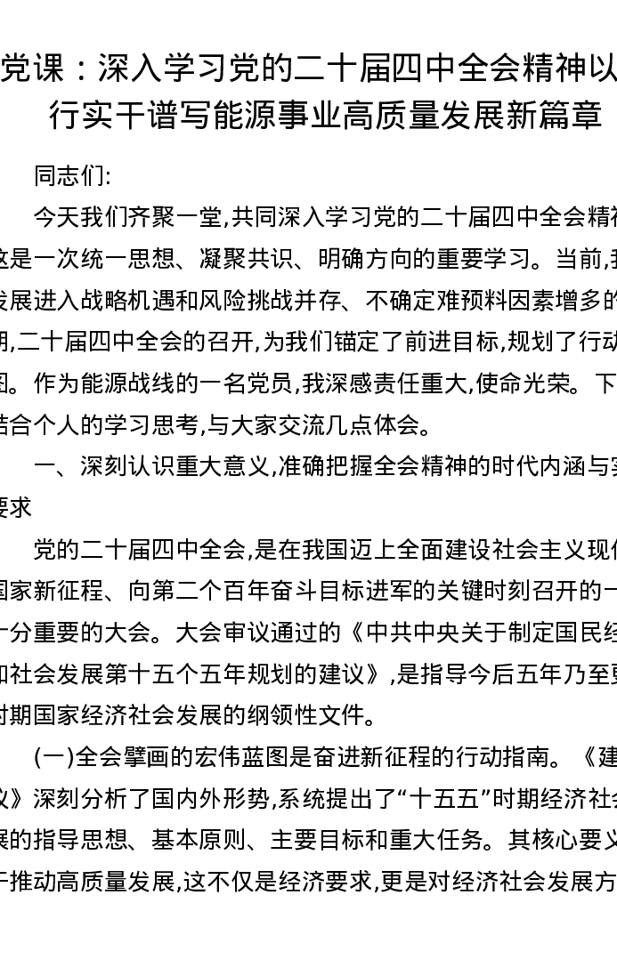 党课:深入学习党的二十届四中全会精神以笃行实干谱写能源事业高质量发展新篇章