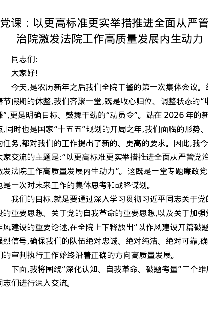 党课:以更高标准更实举措推进全面从严管党治院激发法院工作高质量发展内生动力