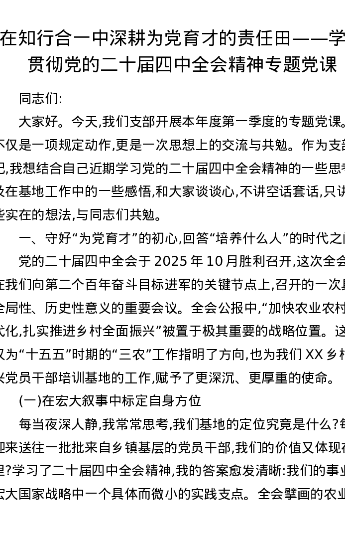 在知行合一中深耕为党育才的责任田——学习贯彻党的二十届四中全会精神专题党课